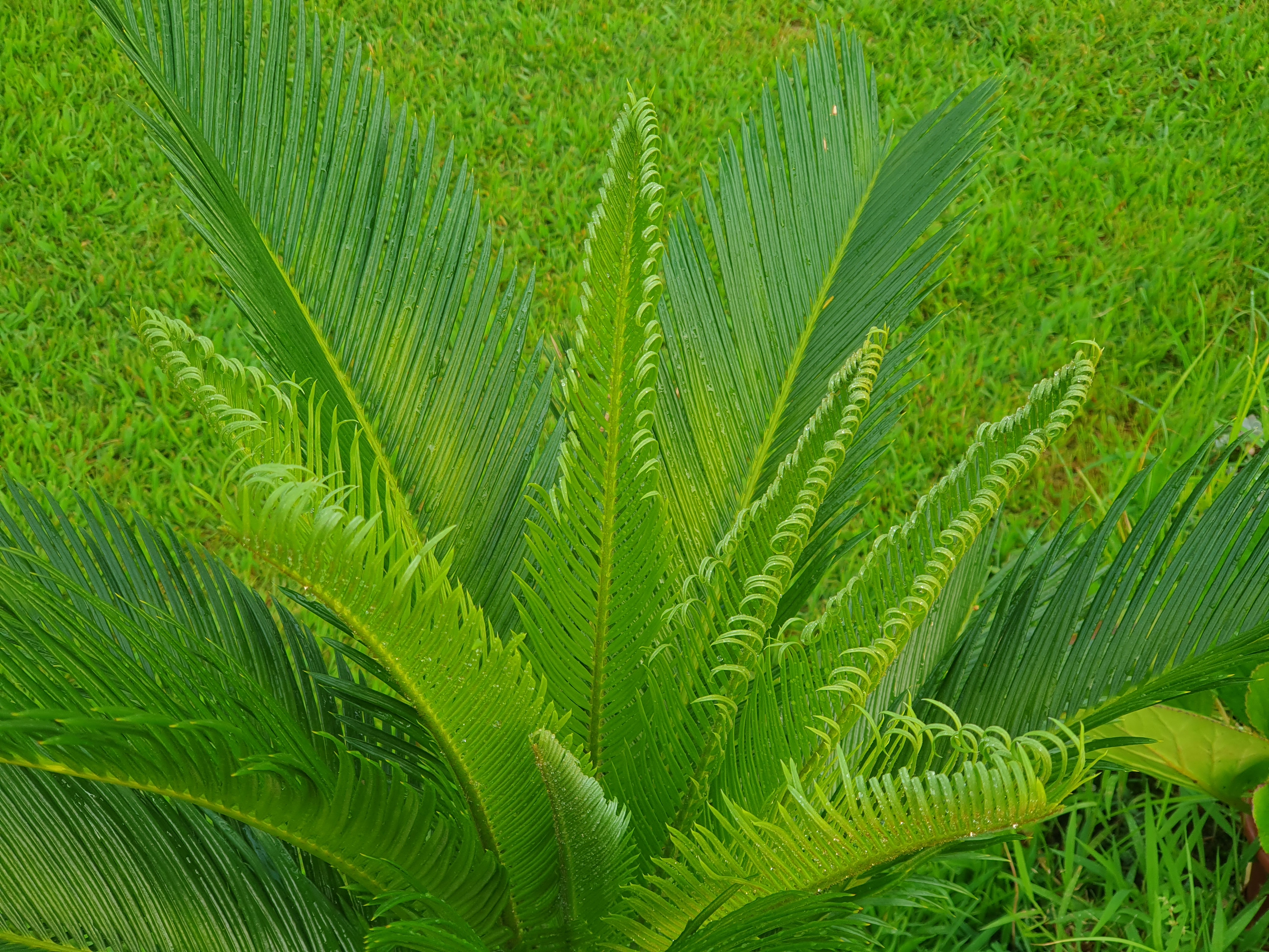 소철 기둥 한가운데서 또르르 말려 올라온 소철 새순이 차례대로 한 잎씩 펼쳐집니다.