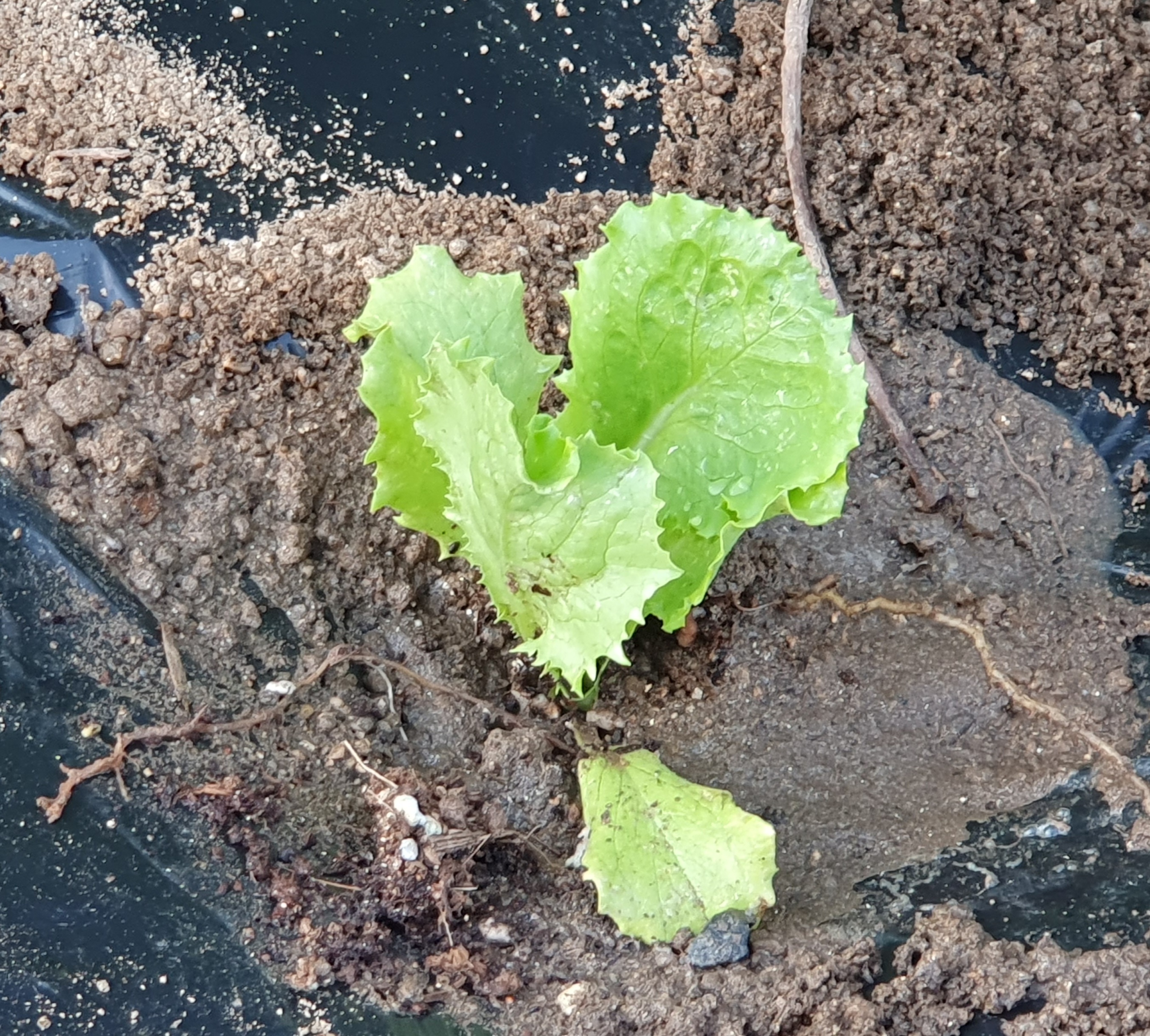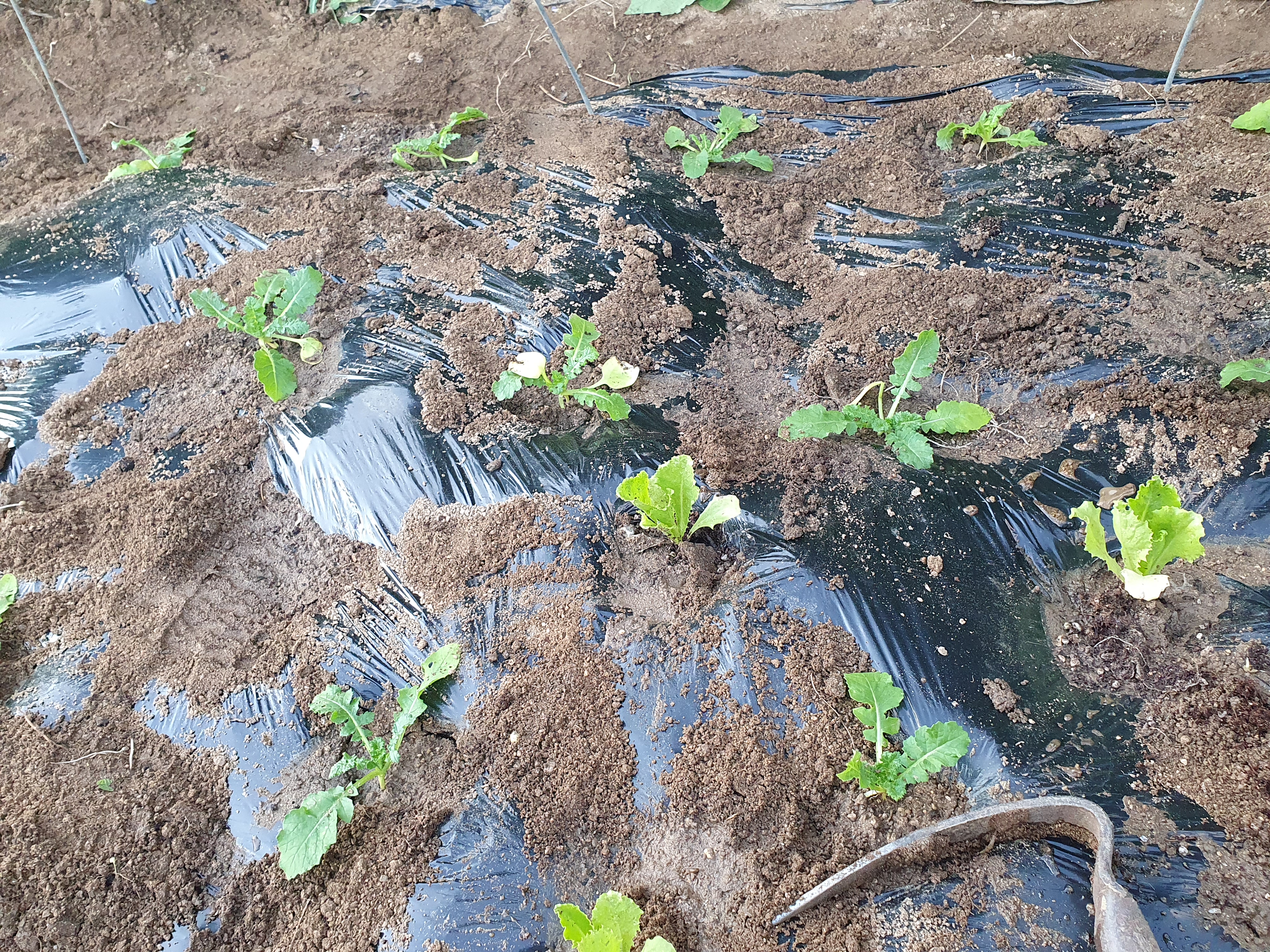 20cm 간격으로 김장무를 심었습니다. 간격이 넓은 듯해서 사이사이 양상추 모종을 심었습니다. 양상추는 빨리 자라니 수시로 잎을 뜯어먹다가 무가 많이 자랄 즈음 포기째 뽑으면 됩니다.