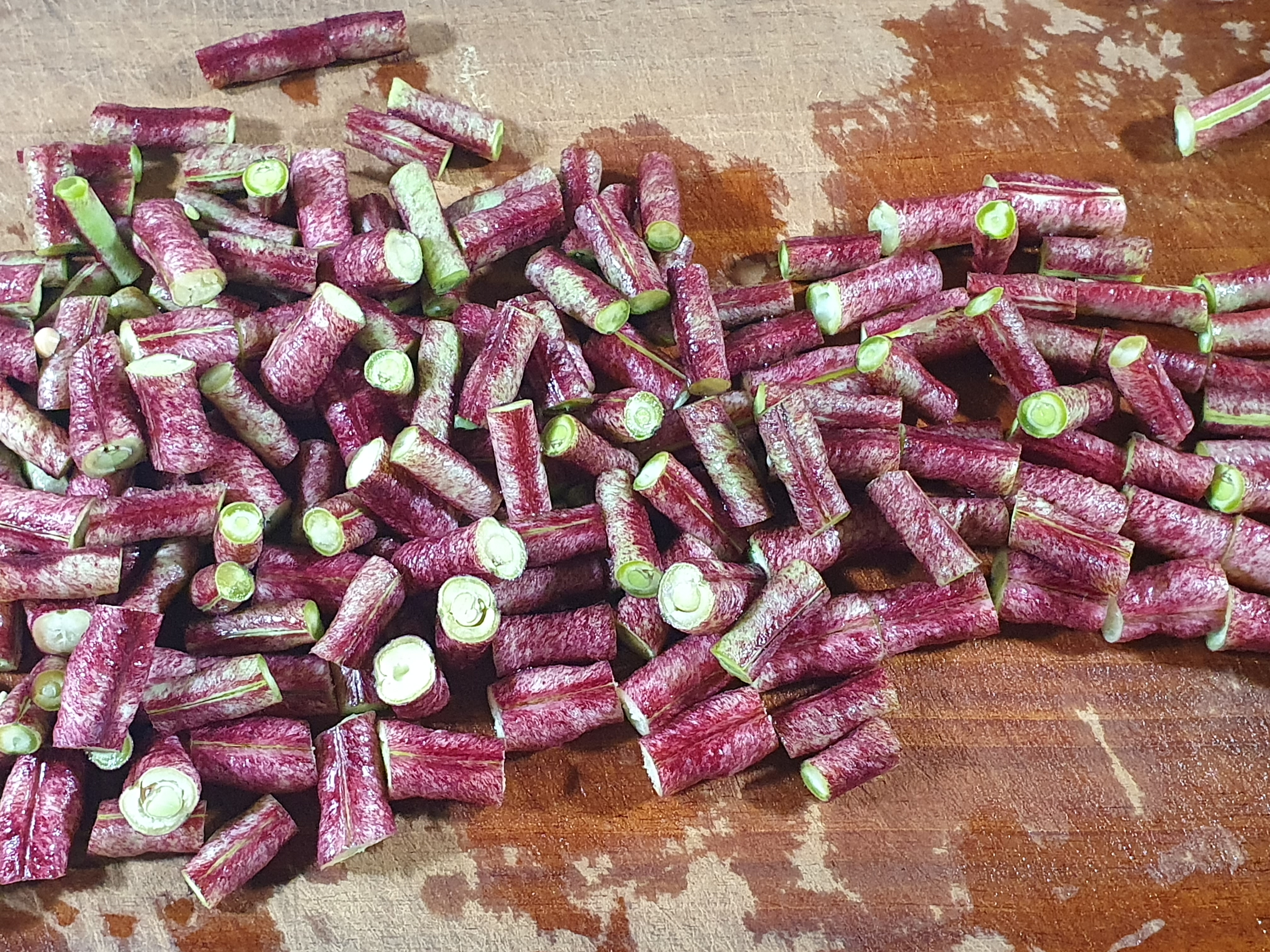길고 긴 갓끈동부콩꼬투리 9개를 2센티미터 간격으로 잘라 줍니다.