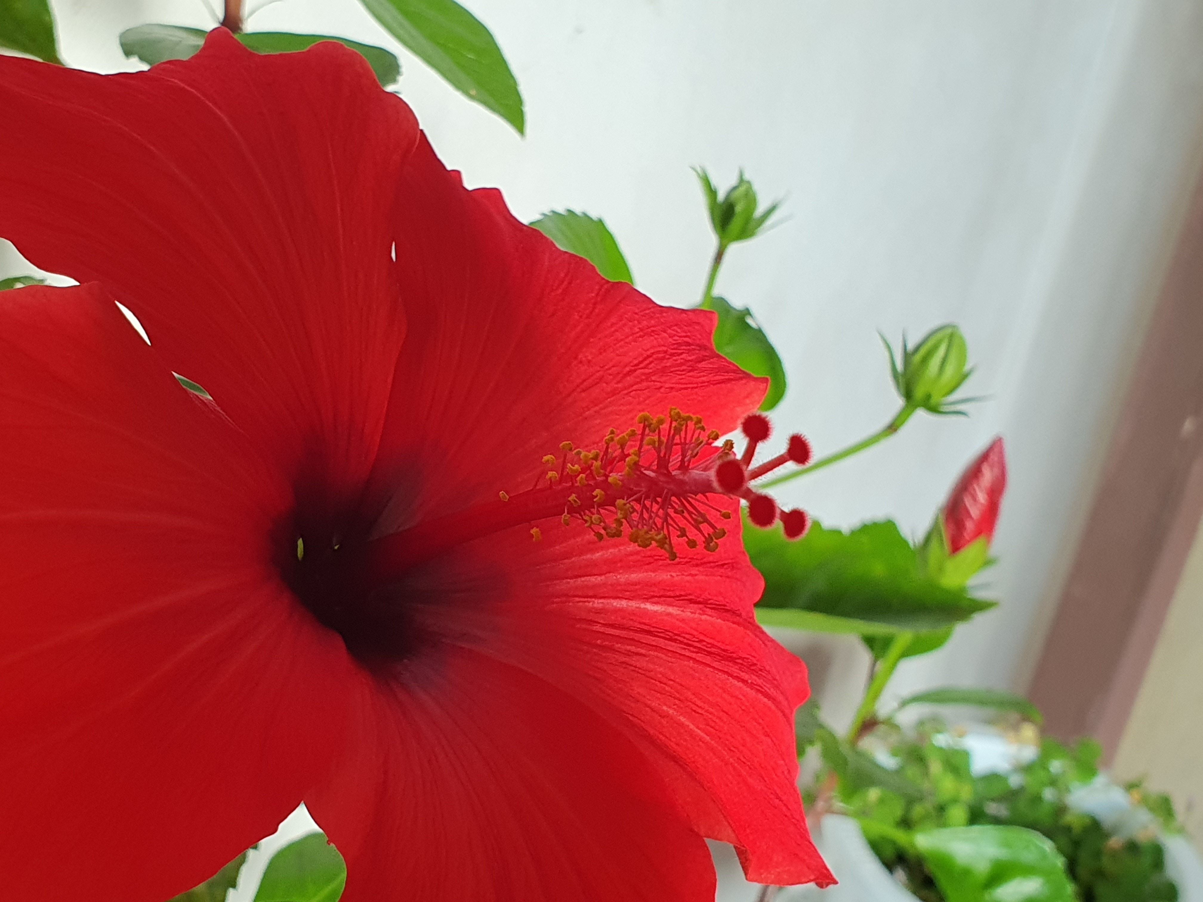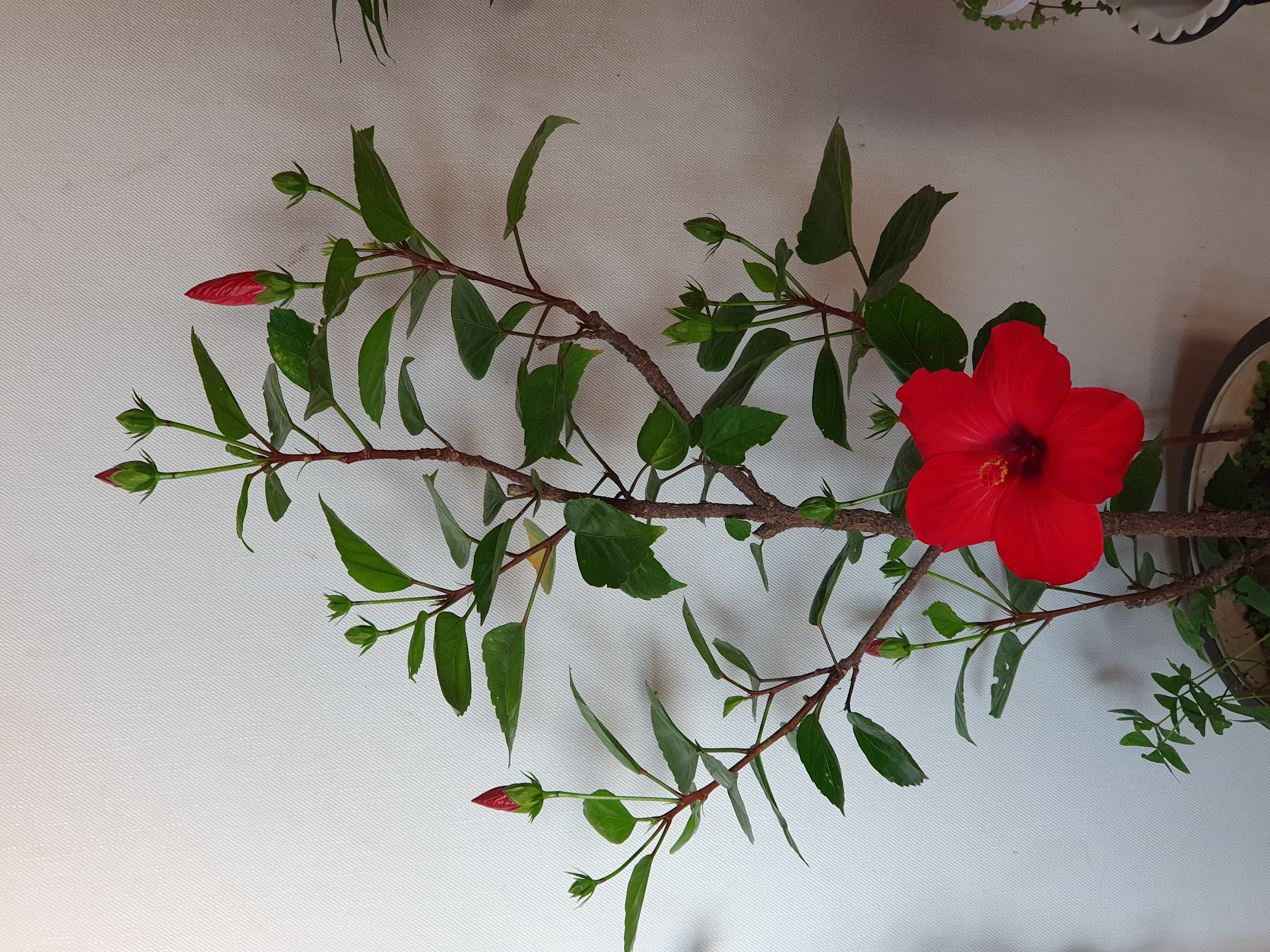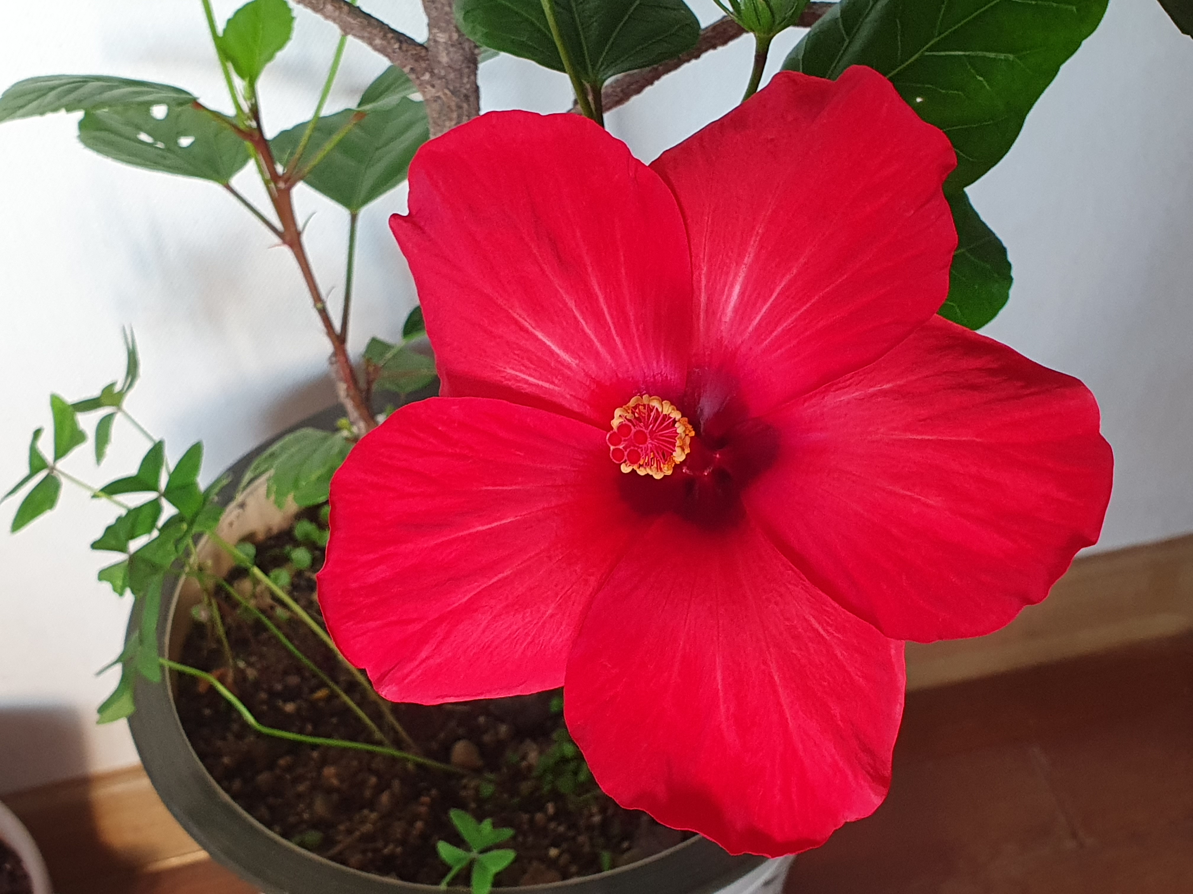 여름내 바깥에서 자랐던 하와이안 무궁화 화분을 집안에 들여놓았습니다.