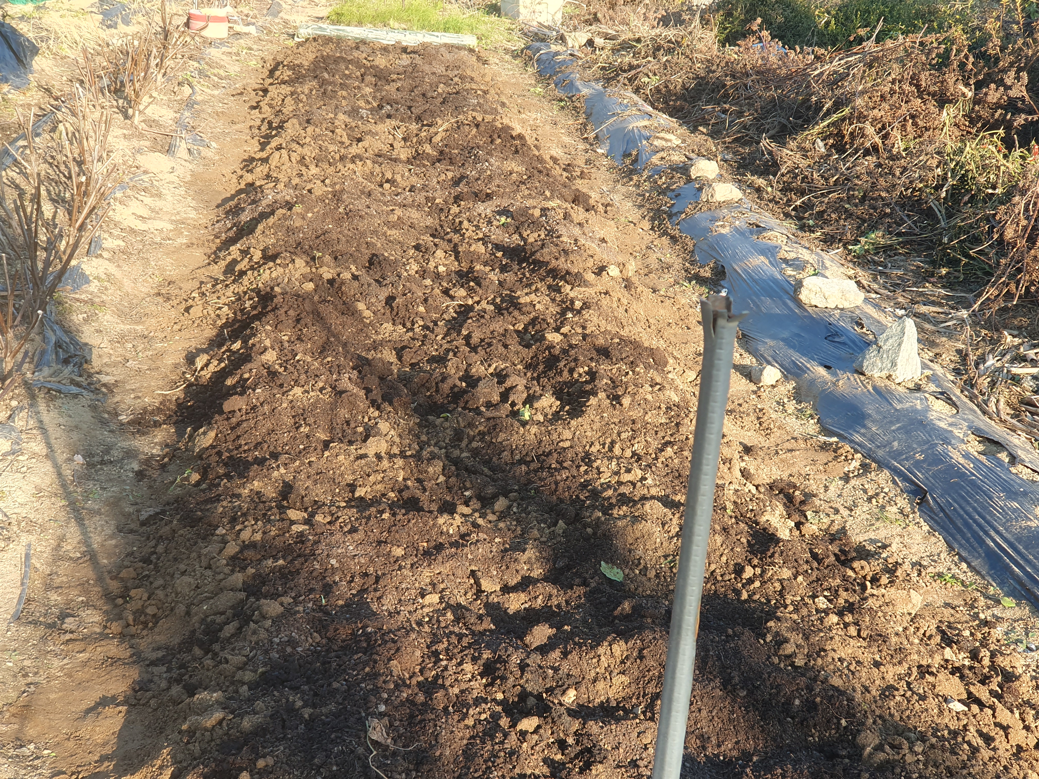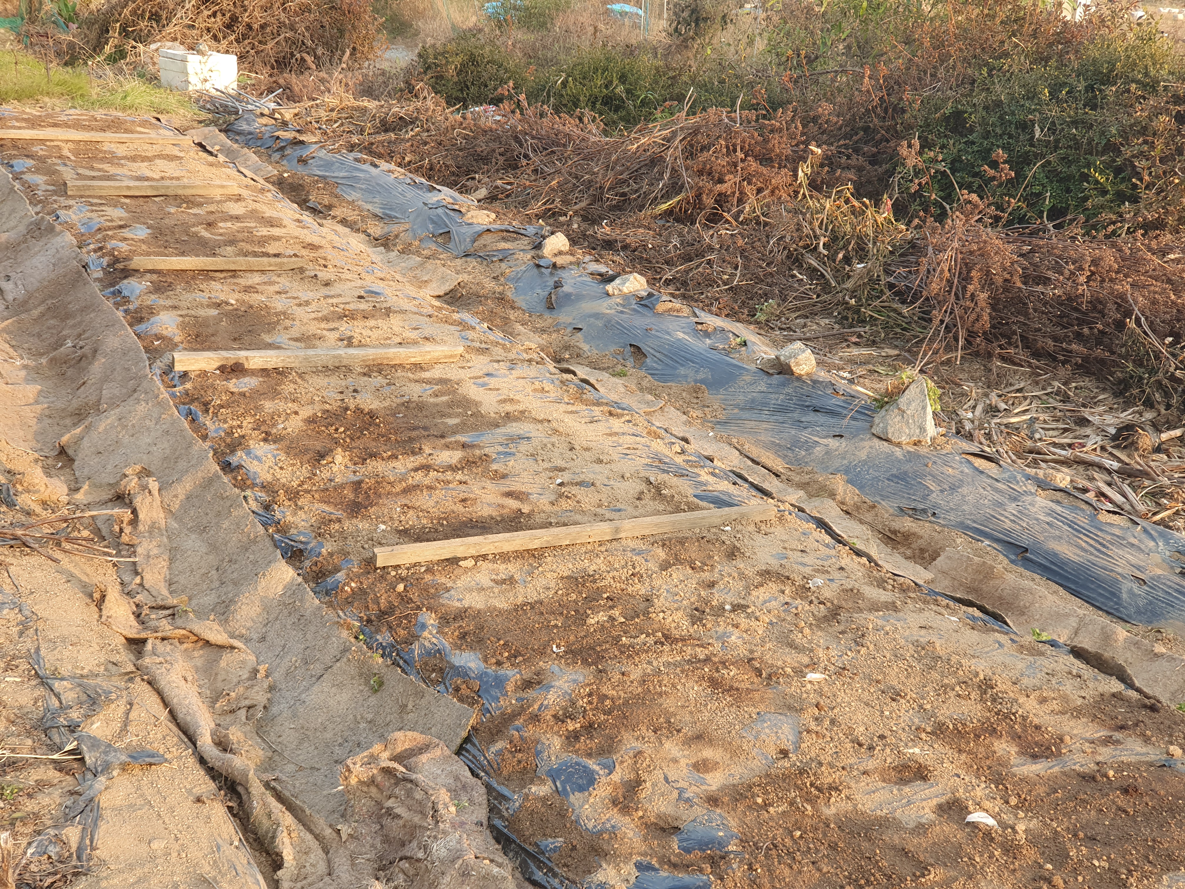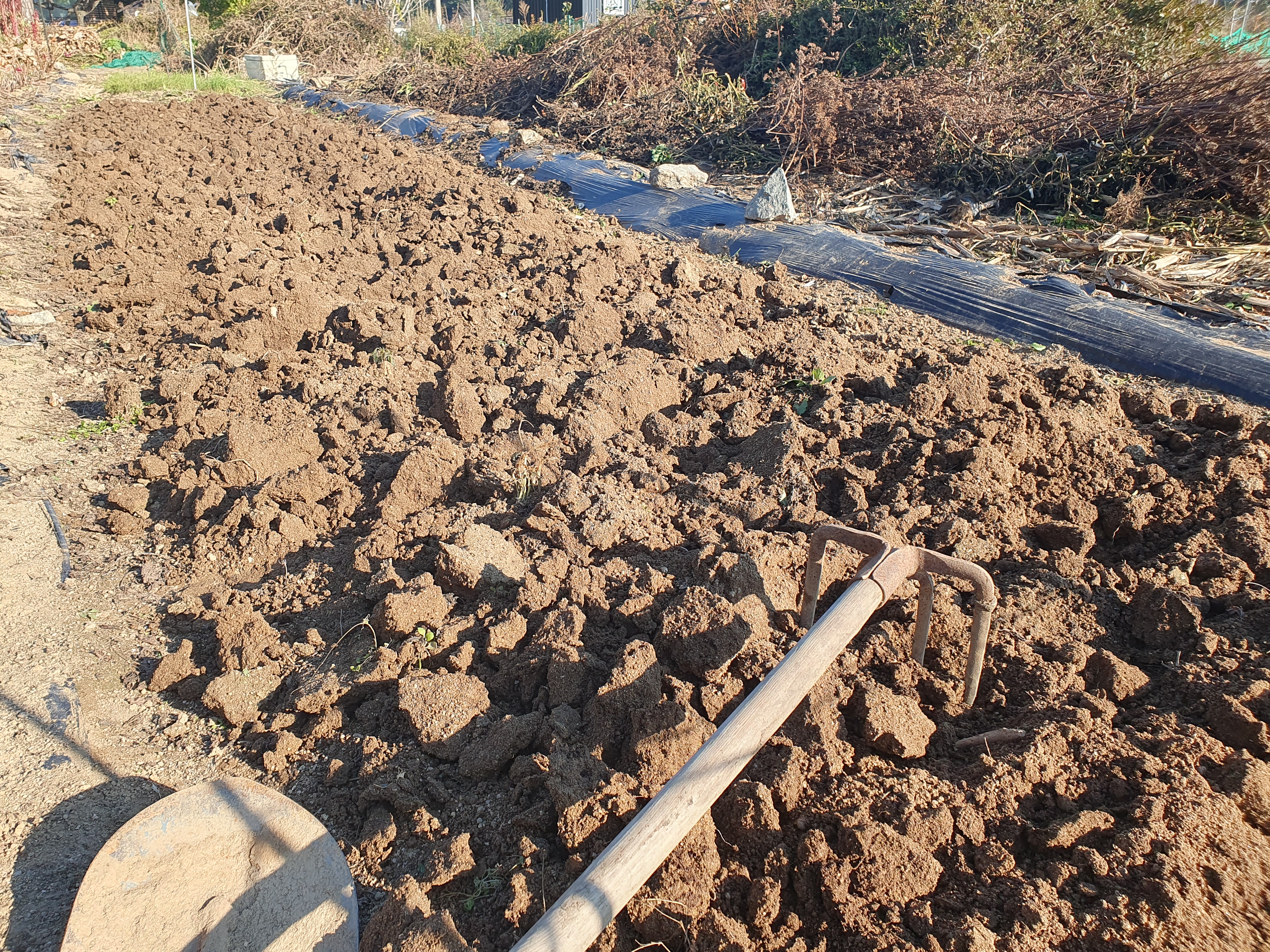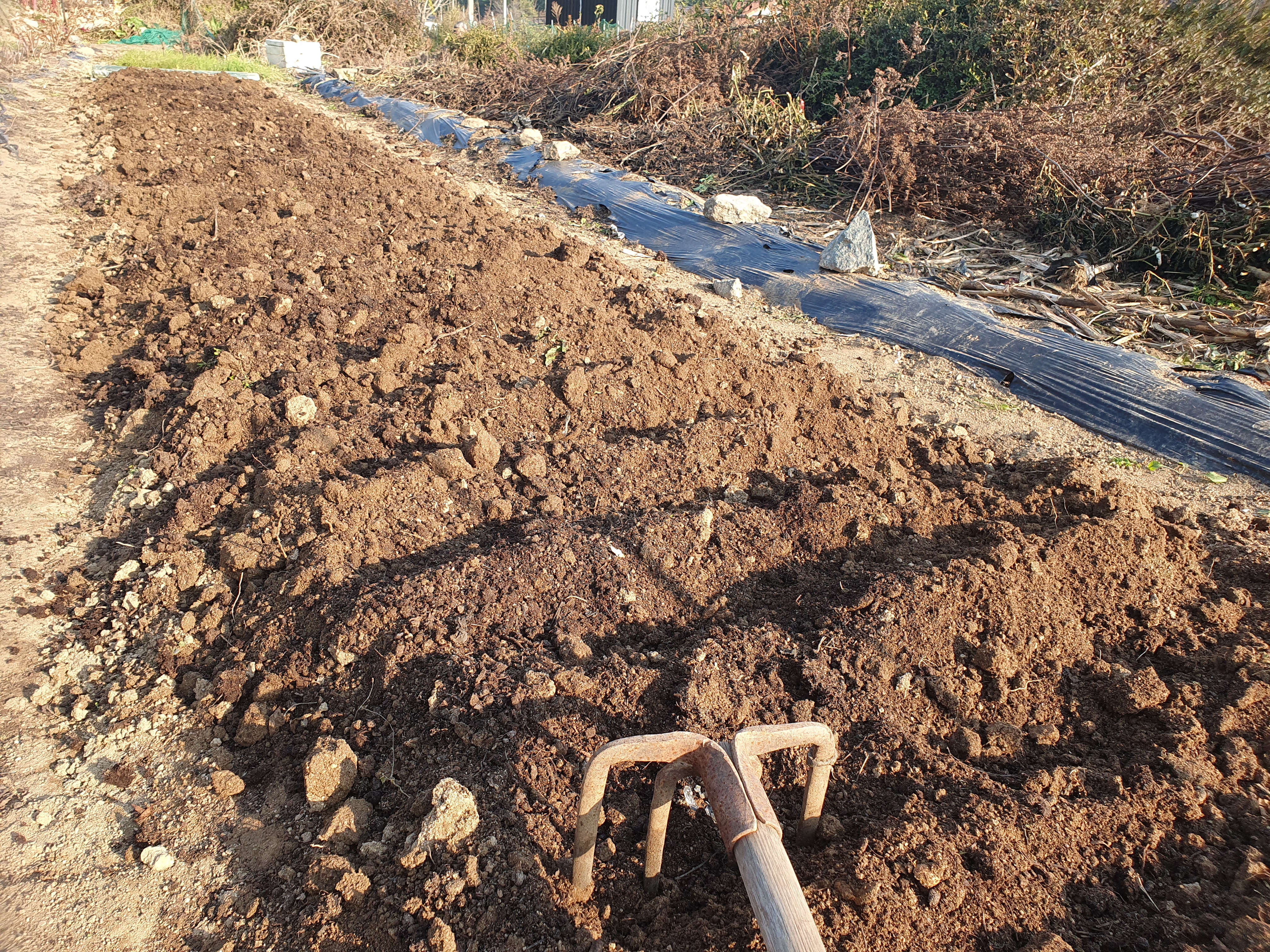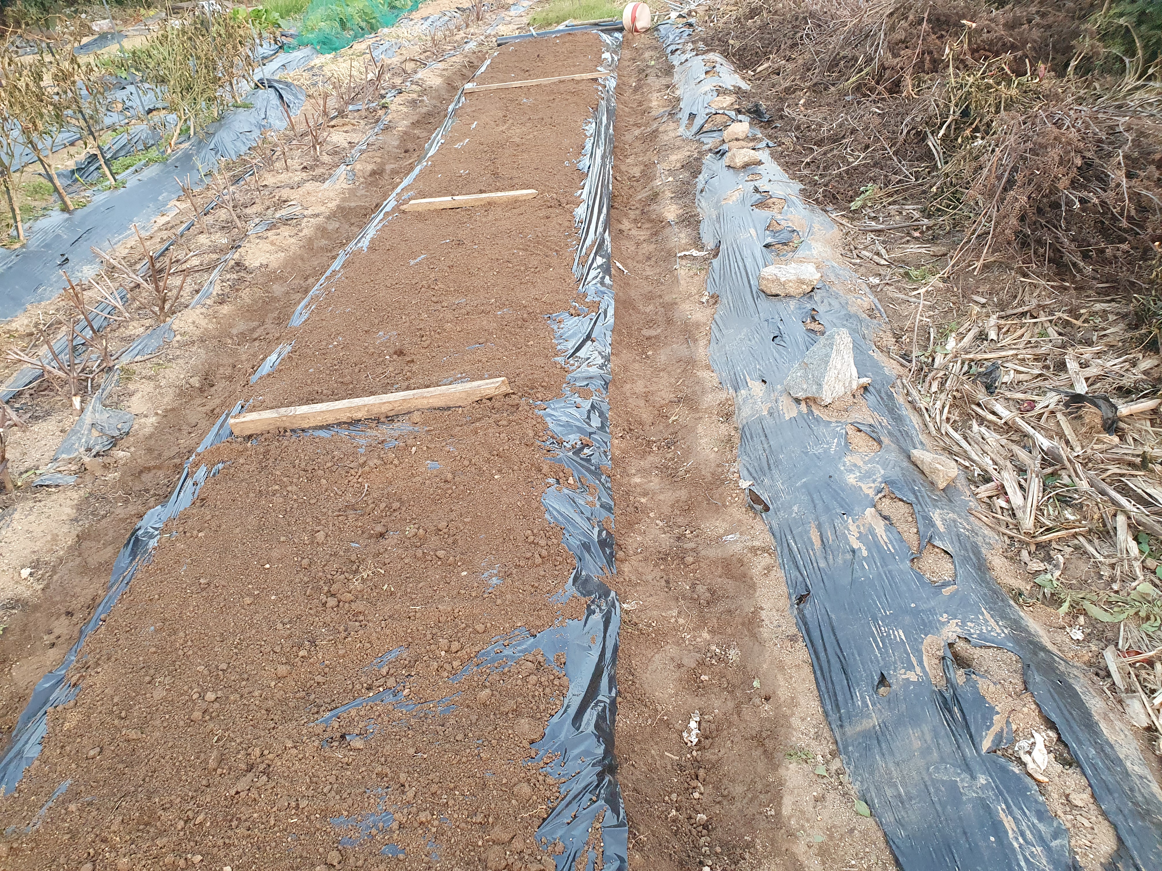 비닐로 덮고, 가장자리에는 고랑의 흙을 파서 덮었습니다. 이로서 가을걷이 및 마늘 심기는 끝이 났습니다. 힘들었던 것만큼 내년 봄엔 수확의 기쁨이 기다릴 것입니다.