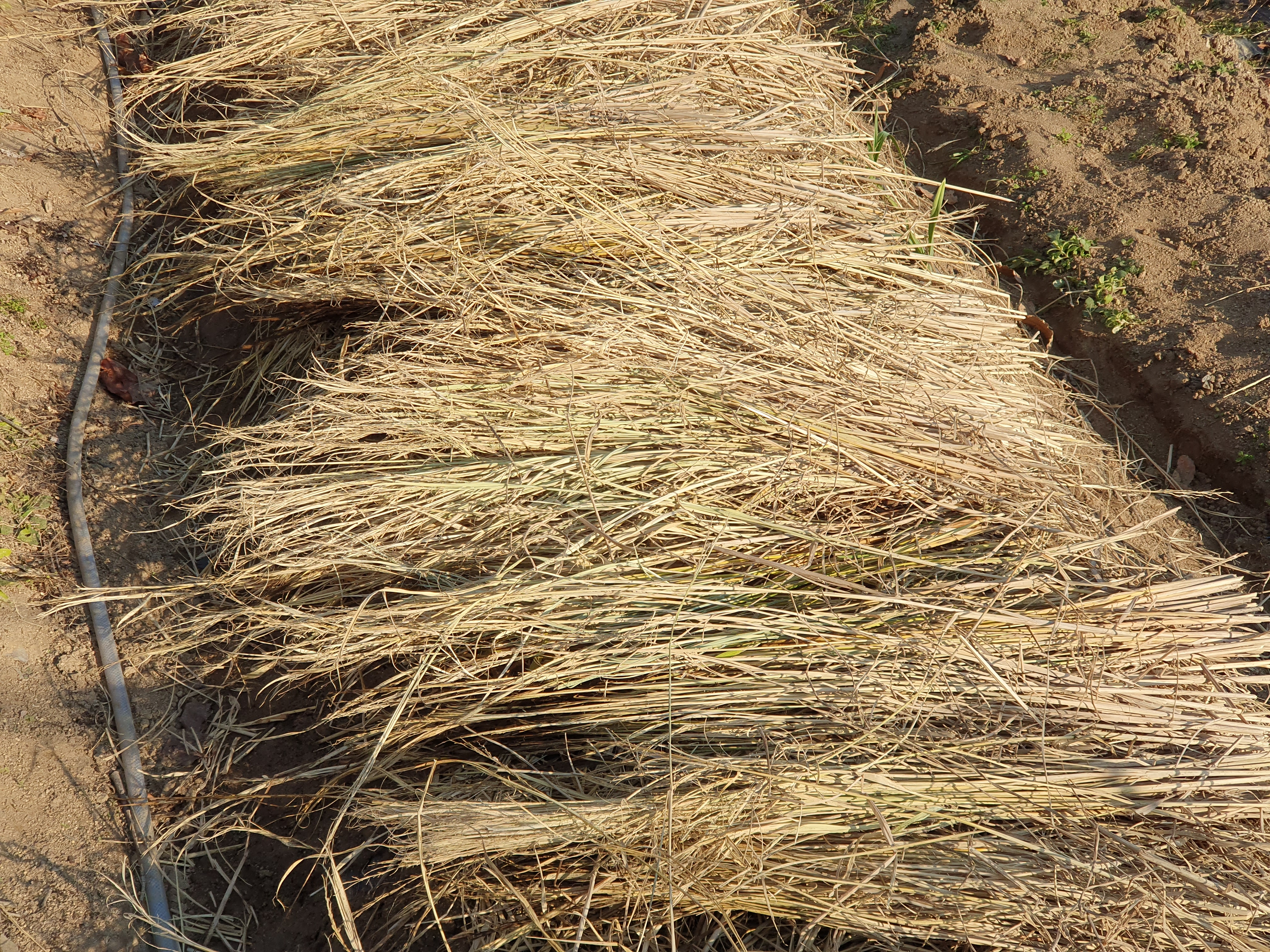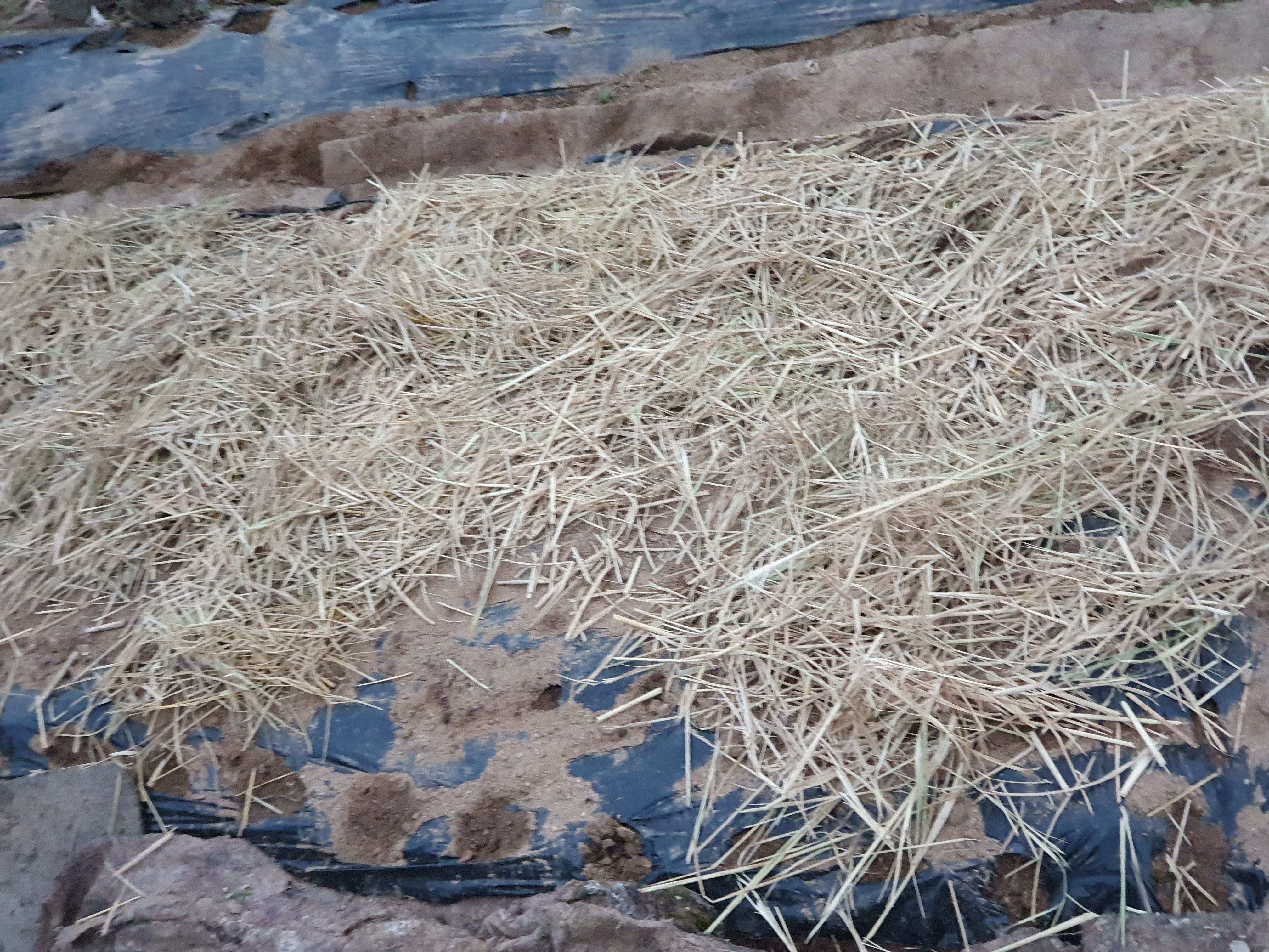 지난번엔 썰어놓은 볏짚을, 오늘은 절단히지 않은 볏짚을 덮었습니다.