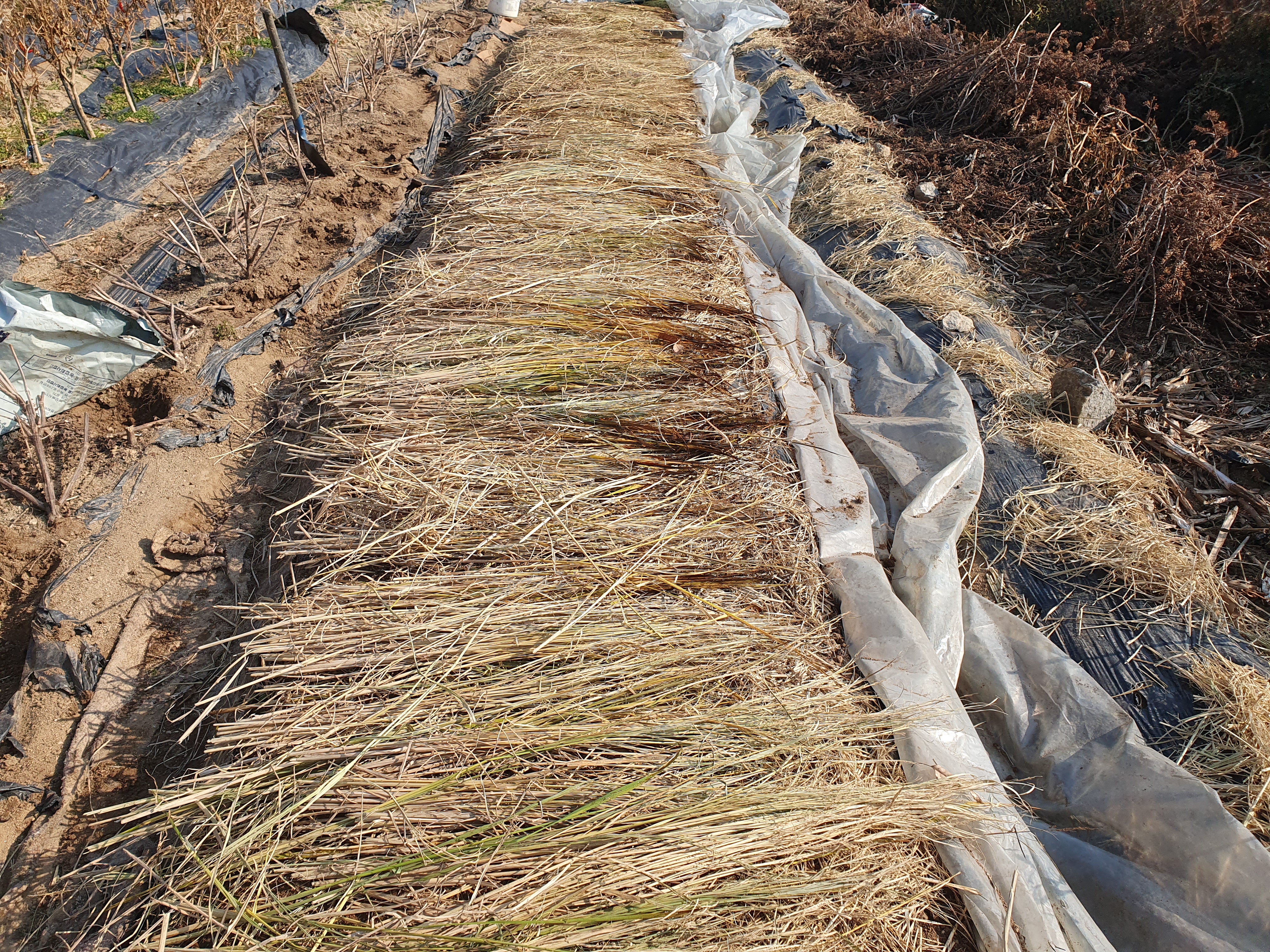 1. 마늘 심은 비닐 위에 볏짚을 덮어줍니다.