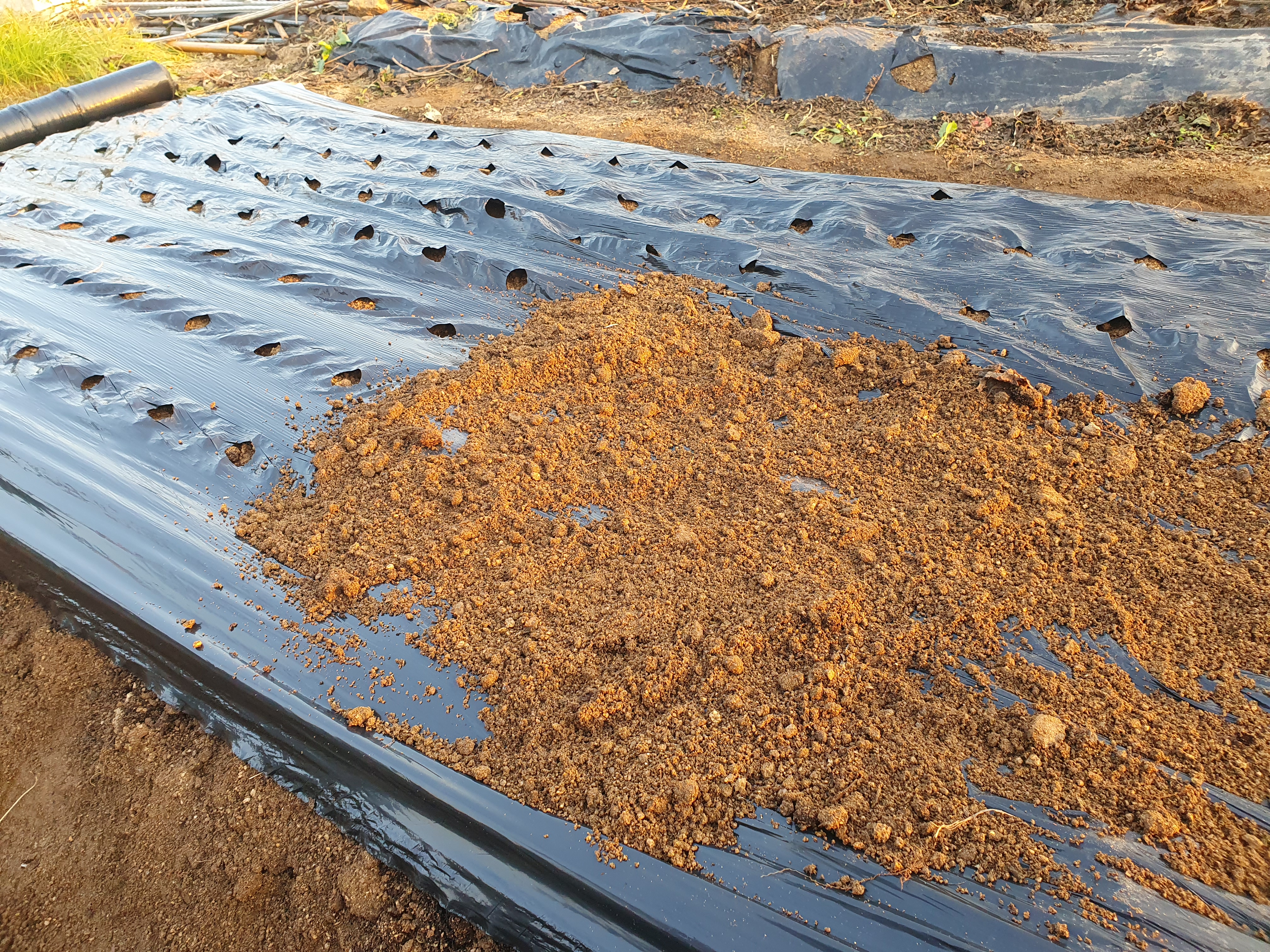 고랑의 흙을 삽으로 퍼서 비닐 위에 덮었습니다.