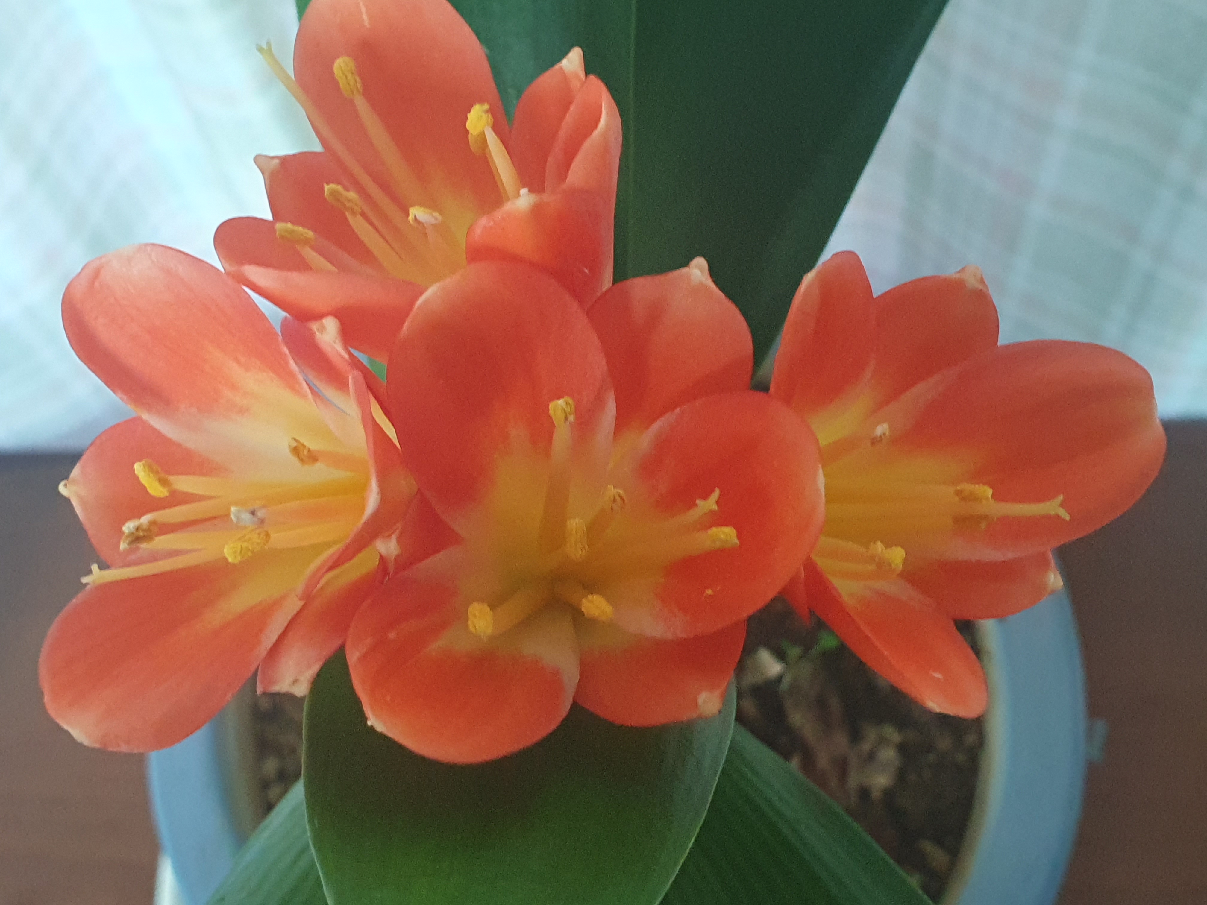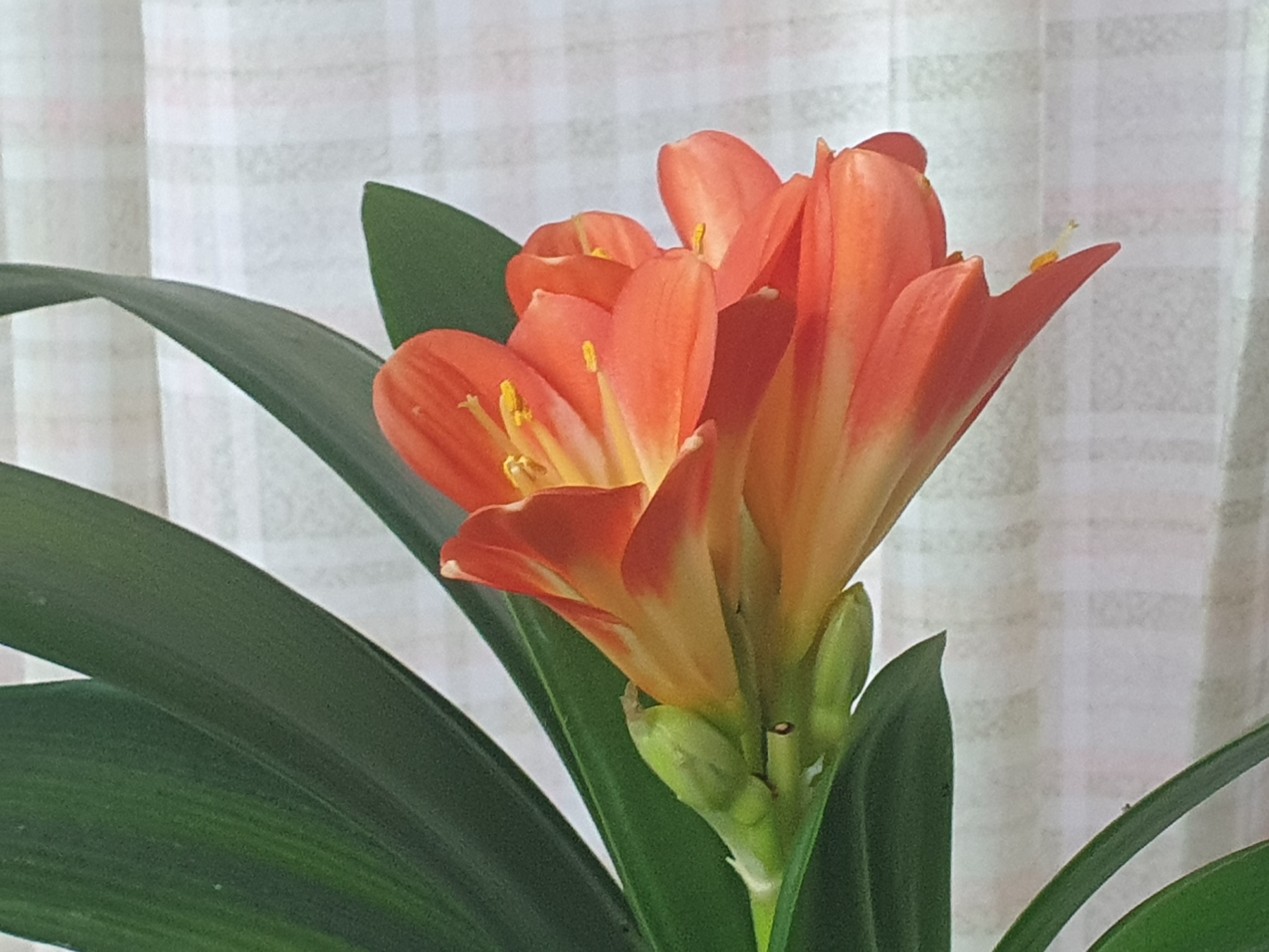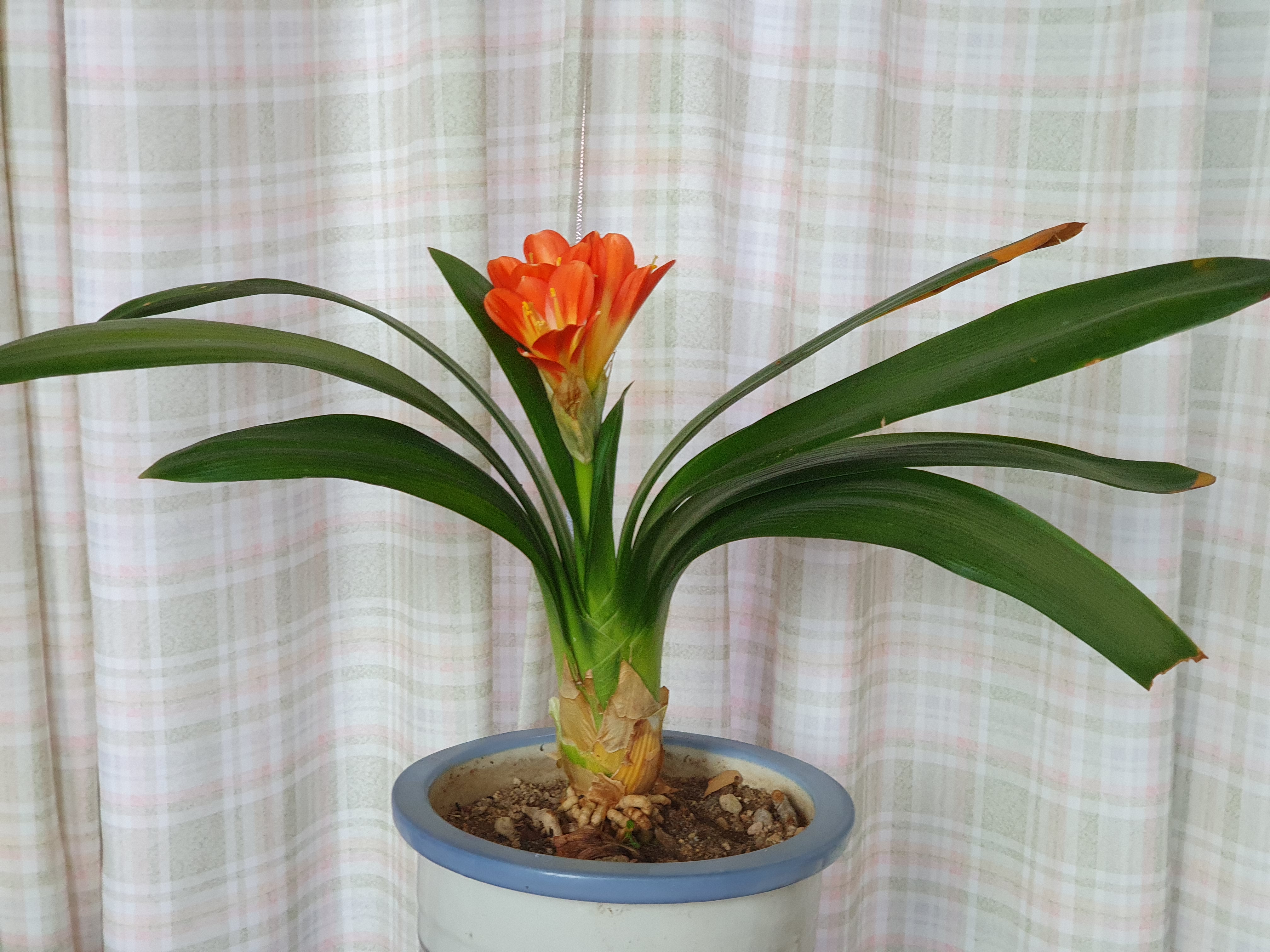 지난봄에 분갈이한 후, 뒷마당에 방치해 두었던 군자란을 겨울 되어 실내에 들여놓았습니다. 잎 속에서 꽃송이 생긴 것이 보였습니다. 한 달이 지난 지금 꽃이 피어나고 있습니다.