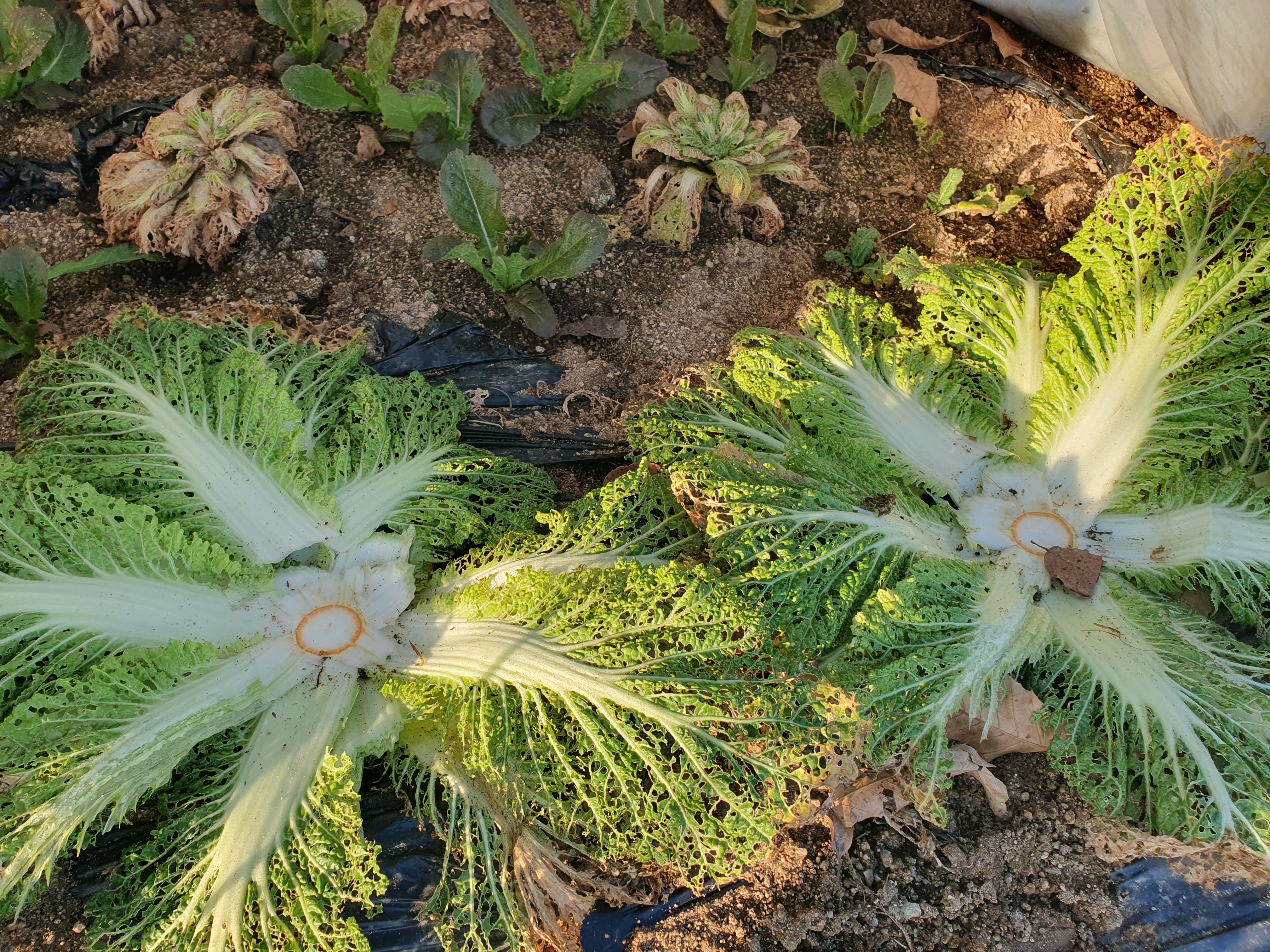 지난여름에 모종 만들어 심었던 김장배추 수확 후, 알이 차지 않은 시원찮은 배추 포기들을 한 곳에 모아 심어 주었습니다. 영하로 내려갔던 11월 말경에 철사로 터널을 만들고 비닐을 덮어주었습니다. 그 위에 부직포를 더 씌워 보온이 되게 했습니다.